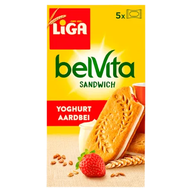 Biscuits met granen (56 %) en met een vulling (13,5 %) met yoghurtpoeder en een vulling (13,5 %) met aardbeiensmaak, en verrijkt met calcium, magnesium en ijzer.