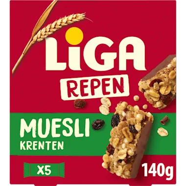 Ingrediënten: HAVERVLOKKEN 22 %, suiker, glucosestroop, krenten, stabilisator (sorbitolen), palmolie, invertsuikerstroop, VOLKORENTARWEMEEL 5,5 %, rijstbloem 5 %, cacaoboter, honing, cacaomassa, magere MELKPOEDER, TARWEZEMELEN, weipoeder (van MELK), bevochtigingsmiddel (glycerol), MELKVET, emulgatoren (SOJALECITHINEN, E471, E476), zout, sheavet, GERSTEMOUTEXTRACT, melasse, aroma. KAN BEVATTEN: PINDA EN NOTEN.