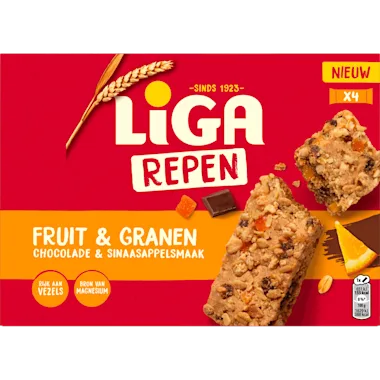Granenrepen met chocoladestukjes en sinaasappelsmaak en verrijkt met magnesium.