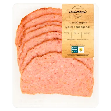 Ingrediënten: 69% varkensvlees*, 15% rundvlees*, 8% ui, TARWEbloem, zout, plantaardige olie (palm, zonnebloem), TARWEmeel, specerijen, aroma, voedingszuur: E326/E331/E262/E330, stabilisator: E452/E450, dextrose, antioxidant: E300, gist, conserveermiddel: E250, natuurlijk aroma. * = Beter Leven keurmerk 1 ster