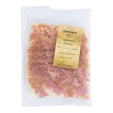 Ingrediënten: water, varkensvlees (44%), varkensgelatine, zout, gehydroliseerd eiwit(SOJA), conserveermiddel(E262, E326, E250), stabilisator(E450, E451, E500), specerijen(SELDERIJ), smaakversterker(E621), suiker, antioxidant(E301), ui.
