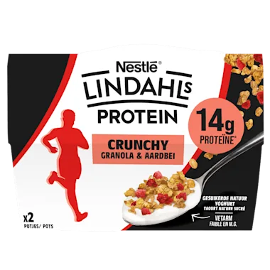 Ingrediënten: Magere gesuikerde yoghurt (90,5%), [Magere MELK (78,7%), MELKeiwitten, MELKzuurfermenten, suiker.], Granola en gevriesdroogde aardbeistukjes (9,5%), [HAVERvlokken, erwteneiwit, TARWE-eiwit, zetmeel, TARWEbloem, SOJA, zonnebloemolie, oligofructose, gevriesdroogde aardbeistukje 0,5% [glucosestroop, suiker, aardbeien, verdikkingsmiddel (natriumalginaat)], maïs, rijst, GERSTEmout, magere cacaopoeder, zout, kokosvlokken, suiker, rijstebloem, natuurlijk aroma.