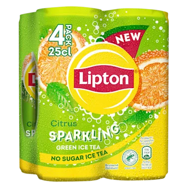 Lipton Ice Tea Sparkling Green Citrus No Sugar is een verfrissende Green Ice Tea ijsthee met bubbels en de smaak van bloedsinaasappel. Deze Sparkling Green Citrus bevat geen suiker en is daardoor laag in calorieën. De Sparkling Green Citrus No Sugar is verkrijgbaar in verschillende formaten, namelijk: 250ml blik, 500ml PET fles en 1500ml PET fles. Lipton Ice Tea Sparkling Green Citrus zonder suiker bevat groene thee-extract en sinaasappelsap. De zoetstoffen in deze ijsthee zijn van natuurlijke oorsprong en deze Rainforest Alliance gecertificeerde bruisende ijsthee bevat geen kleurstoffen. Het is een perfecte keuze voor iedereen die op zoek is naar een heerlijke verfrissing zonder suiker: 0% sugar, 100% taste.