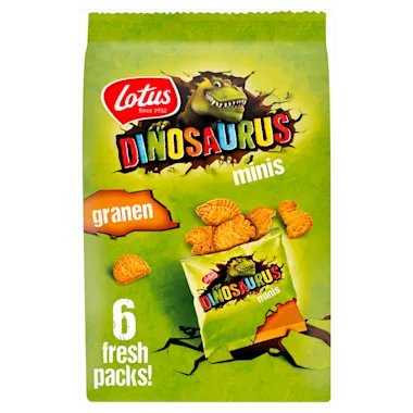 Lotus Dinosaurus Granen mini's. Barstensvol granen die je doen brullen van energie! Vershoudpak, nog krokanter. Zonder bewaarmiddelen, zonder kleurstoffen, Kraakt naar meer.