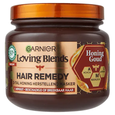 Het Loving Blends Honing Goud haarmasker van Garnier is onze ultieme masker voor beschadigd haar. Ontdek de kracht van een bijenkorf: onze 3-tal honingen acacia, manuka en lavendel, bekend om hun herstellende, versterkende & voedende eigenschappen voor het haar, zijn samengevoegd in onze herstellende remedie. Het herstelt de 3 belangrijke tekenen van haarschade intensief: gespleten punten, haarbreuk, en haarscheuren in enkel 1 minuut: