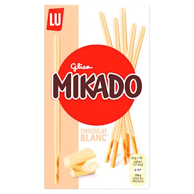 Witte Mikado-chocolade 70gr., dat is de combinatie van een lang fijn en knapperig koekje en een heerlijk smeltend laagje waar liefhebbers van witte chocolade dol op zullen zijn. In een formaat dat ideaal is om overal mee naartoe te nemen. De onweerstaanbare witte Mikado-chocoladesticks kunnen op wel duizend verschillende manieren worden gegeten, heerlijk voor tussendoor.Smul ervan voor de tv of een videogame. Of gebruik ze om je toetjes te versieren met een knapperige touch. Het leven is een stuk leuker met een pakje Mikado.