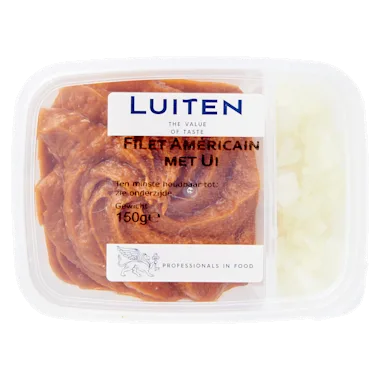 Ingrediënten: Filet americain 87% (rundvlees 42%, water, rijstebloem 15%, raapzaadolie, SCHARRELEIGEEL, voedingszuren: E260, E261, E262, E326, E330; zout, tomatenpuree, suiker, tuinbooneiwitconcentraat, specerijen [bevat MOSTERD], extract van paprika, gemodificeerd maïszetmeel, natuurazijn, zetmeel [rijst, aardappel], glucosestroop, dextrose, verdikkingsmiddel: E401, E407, E412, E415; natuurlijke aroma's [bevat MOSTERD], gedroogde groente [tomaat, champignon], stabilisator: E331; gistextract, gehydrolyseerde plantaardige eiwitten [raapzaad, koolzaad], gekarameliseerde suiker, MELKEIWITTEN, conserveermiddel: E202; antioxidant: E300; specerijenextracten [SELDERIJ, chilipeper], ui 13%. Luiten B.V. Postbus 2152700 AE Zoetermeer