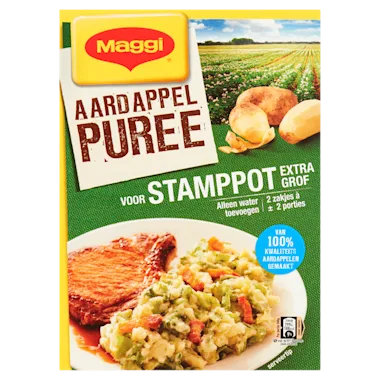 Gebruiksaanwijzing voor 1 zakje. Pan 10 min. 1) Met rauwe groente: Doe 500ml water in een pan en breng dit aan de kook. Met gekookte groente: Kook 300g rauwe groente. Doe dan 500ml water of groentekookvocht in de pan en breng dit aan de kook. 2) Met rauwe of gekookte groente: Neem de pan van het vuur. Voeg, al roerend met een garde, de inhoud van het zakje aardappelpuree toe. Zout en boter toevoegen is niet nodig. 3) Met rauwe of gekookte groente: Roer de groente (300g rauwe groente of gekookte groente) door de aardappelpuree. 4) Met rauwe of gekookte groente: Verwarm het geheel eventueel en roer nog even goed door.