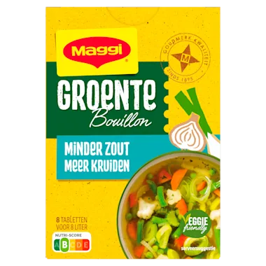 Minder zout, meer kruiden. Goed om te weten. Maggi Groentebouillon minder zout, meer kruiden is vol van smaak en bevat 25% minder zout.. Maggi - Goudmerk kwaliteit - Sinds 1895.. Maggi werkt aan een afvalvrije toekomst; 100% van onze verpakkingen moet in 2025 recyclebaar of herbruikbaar zijn.. Kijk voor heerlijke Maggi recepten op: www.maggi.nl. Een verpakking bevat 32 porties.