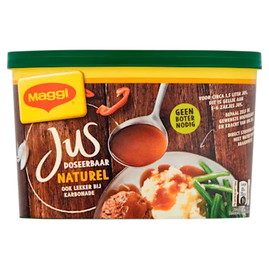 Met MAGGI doseerjus naturel maak je in een minuut een heerlijke, krachtige jus.