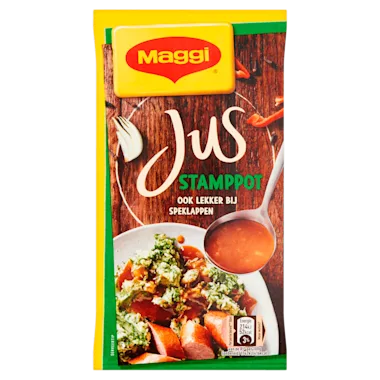 De Maggi jus voor stamppot is een juspoeder waarmee je eenvoudig en snel een heerlijke jus met een krachtige smaak op tafel zet. Lekker bij aardappelen of stamppot!