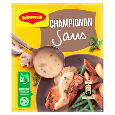 Ingrediënten: zetmelen (erwt, maïs), plantaardige oliën (palm, zonnebloem, in wisselende verhoudingen), gejodeerd zout, champignons 5,7%, LACTOSE, gistextract, uien 2,9%, aroma's (bevat MELK, GLUTEN), MELKeiwitten, gekarameliseerde suiker, peterselie. Bevat mogelijk: SELDERIJ, EI, MOSTERD, SOJA.