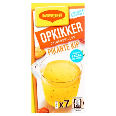 MAGGI Opkikker drinkbouillon pikante kip is een lekker hartig tussendoortje. Het bevat maar 8 kcal per portie bouillon en is pittig van smaak. Daar kikker je van op!