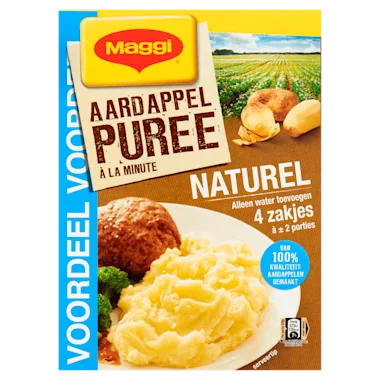 Gebruiksaanwijzing voor 1 zakje. Pan of waterkoker 5 min. 1) Doe tussen de 350ml en 400ml water in een pan of waterkoker en breng dit aan de kook. Giet het water in een schaal of kom. 2) Voeg geleidelijk, al roerend met een garde, de inhoud van het zakje toe. Zout en boter toevoegen is NIET nodig. Magnetron 5 min. 1) Doe tussen de 350ml en 400ml koud water in een kom en voeg al roerend met een garde de inhoud van het zakje toe. 2) Verwarm de puree 4 min. in de magnetron op vol vermogen (± 800 watt). Roer de puree na 1,5 min. en aan het eind van de bereiding even door. Zout en boter toevoegen is NIET nodig.