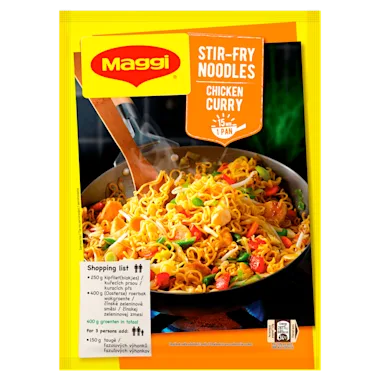 Ingrediënten: Noedels 86,5% (TARWEbloem, zonnebloemolie, zout, stabilisator (E452), TARWEGLUTEN, zuurteregelaar (E501), antioxidant (E319)). Mix 13,5% (suiker, maïszetmeel, zout, aroma's (bevat TARWE, SELDERIJ), specerijen (kerrie, gember, kurkuma, knoflook, karwijzaad, kaneel, cayennepeper), gistextract, zonnebloemolie, gekarameliseerde suiker). Bevat mogelijk: SOJA, MELK, EIEREN, SESAM, MOSTERD.