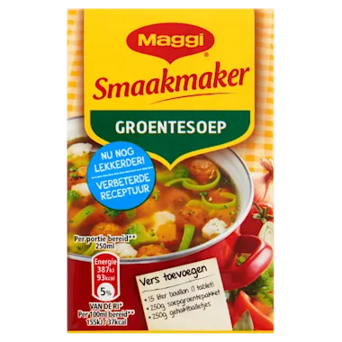 Met MAGGI Smaakmaker groentesoep voeg je gemakkelijk extra smaak toe aan jou maaltijdsoep.