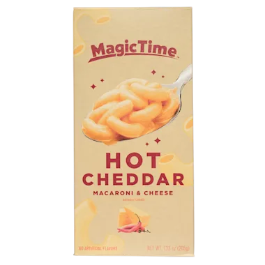 Ingrediënten: macaroni (TARWEmeel), kaaskruiden (verrijkt TARWEmeel [niacine, gereduceerd ijzer, thiaminemononitraat, riboflavine, foliumzuur], maltodextrine, wei (MELK), zout), bevat 2% of minder van: specerijen, kleurstoffen (annatto norbixine, kurkuma extract, paprika extract), sojaolie (om het stuiven te verminderen), antiklontermiddel (siliciumdioxide), voedingszuren (citroenzuur, natriumfosfaat), natuurlijke aroma’s, cheddar kaas (gepasteuriseerde MELK, kaascultuur, zout, enzymen), room (MELK), stabilisator (natriumcaseïnaat (MELK)).