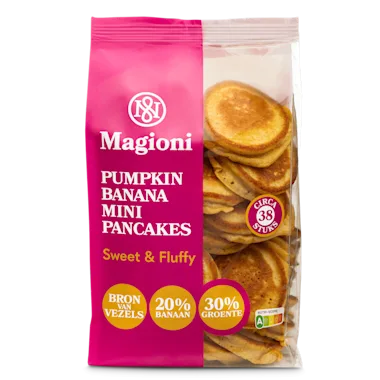 Ingrediënten: pompoenpuree (30%), bananenpuree (20%),gepasteuriseerd ei, speltmeel (tarwe), boekweitmeel, gepasteuriseerd ei-eiwit, honing, ei-eiwitpoeder, zonnebloemolie, cichorei, bakpoeder (rijsmiddel (E450, E500), antiklontermiddel (calciumcarbonaat), maïszetmeel), water, conserveermiddel (E202), antioxidant (ascorbinezuur), zuurteregelaar (citroenzuur). Kan melk, noten, sojabonen, sesamzaad en sulfieten bevatten.