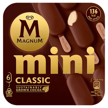 Als je de klassieke Magnums iets te groot vindt, geniet dan van Magnum Mini IJs. De Magnum Mini Classic is het ultieme tussendoortje voor mensen die groots willen genieten van iets kleins. Magnum Mini Classic IJs is de perfecte balans tussen fluweelzacht vanille-ijs, omhuld met een laag krakende Magnum melkchocolade. Perfect voor een ultiem genietmoment. En omdat er in de verpakking zes van deze ijssticks zitten, kun je de ijsjes perfect delen. Ontdek het volledige verleidelijke assortiment, van Magnum Klassiekers, Magnum Doubles, Magnum Mini's tot Magnum Pints. Perfect om van te genieten tijdens een warme zomerdag of tijdens een gezellige winteravond op de bank. Witte chocolade, melkchocolade en pure chocolade, Magnum heeft het allemaal. Van handijs tot ijsbekers: voor welk ijsje ga jij? De kenmerkende ijsstokjes zijn gemaakt van FSC & PEFC gecertificeerd hout. Magnum ijs wordt bovendien gemaakt met 100% hernieuwbare energie.