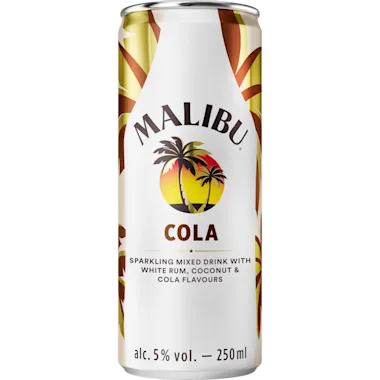 Suitable for vegans. Malibu Cola is a classic drink, a mix with rum, coconut and cola flavours. Enjoy!.