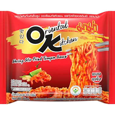 Ingrediënten: Noedels (75g): TARWEbloem (Australië, Amerika, Canada) 58%, gemodificeerd tapioca zetmeel, palmolie, zout, zuurteregelaar: E451; E500; E501, verdikkingsmiddel: E466. Kruidenpoeder (5,5g): Suiker, zout, smaakversterker: E621; E635, chilipoeder, voedingszuur: E330, gedroogde lente ui, GARNALENpoeder, paprikapoeder,aroma (SOJA), capsicum oleoresin. Chilipasta (4,0g): Palmolie, kruiden, palmsuiker, chili, gedroogde GARNALEN. Gedroogde garnalen (0,5g).