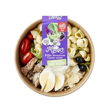 Ingrediënten: gekookte pasta (water, durum TARWEGRIESMEEL, olijfolie, zout), romaine sla, SCHARRELEI, gegrilde kip (95% kip, zout, zuurteregelaar: E331, E640, stabilisator: E451, E450, plantaardige vezels, rijstzetmeel, water), cherry tomaat, caesar dressing (64% mayonaise (raapolie, azijn, EIGEEL, water, suiker, zout, MOSTERDZAAD, antioxidant: rozemarijnextract, conserveermiddel: kaliumsorbaat, aroma (SOJA, SELDERIJ)), azijn (SULFIET), zonnebloemolie, MOSTERDZAAD. suiker, kruiden, 1,2% ANSJOVIS, zout, specerijen, SOJABONEN, olijfolie, natuurlijk aroma, rode wijnazijn, kruiden), knoflook-kruiden croutons (TARWEBLOEM, verrijkt TARWEBLOEM, zonnebloemolie, zout, dextrose, gist, gistextract, knoflook, uipoeder, peterselie, natuurlijk aroma, rozemarijnextract), kaassnippers (MELK, zout, stremsel), zwarte olijven (kleurstof: E579), conserveermiddel: azijn, melkzuur