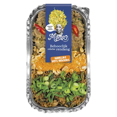 29% gegaarde rijst (water, basmatirijst), runderriblap, kokosextract, lente-ui, water, ui, pinda's, kokos, suiker, suikerstroop, zout, selderijblad, rode peper, tomatenpuree, wortel, uien, prei, witte kool, azijn, paprika, gember, aroma’s, sjalot, specerijen, knoflook, tamarindepulp, gehydrolyseerd maiseiwit, gehydrolyseerd soja-eiwit, invertsuiker, salmiak, rijst, garnalenpoeder, citroengras, tangerineschil, tarwebloem, sojabonen, kruiden, kruidenextract, specerijenextract (selderij), glucosestroop, natuurlijke aroma's, alcohol, gemodificeerd maïszetmeel, sesamzaadpasta, zoete aardappelpoeder, melado, conserveermiddelen (e202, e211, e260), emulgator (e435), kleurstoffen (e100, e150a, e150d), smaakversterker (e621), stabilisator (e412), verdikkingsmiddel (e415), voedingszuren (e260, e330, e338).