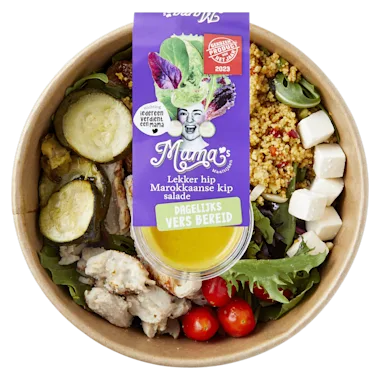 Ingrediënten: gekookte en aangemaakte couscous (water, durum TARWEGRIESMEEL, rode paprika, courgette, komkommer, munt, zonnebloemolie, kruiden en specerijen), gegrilde kip (95% kip, zout, zuurteregelaar: E331, E640, stabilisator: E451, E450, plantaardige vezels, rijstzetmeel, water), mesclun mix (sla groen, sla rood, rucola, red chard), cherry tomaat, mango curry dressing (raapolie, suiker, MOSTERDZAAD, azijn, 10,6% mango, papaja, EIGEEL, water, zout, 0,5% currypoeder, specerijen, aroma (SOJA, SELDERIJ), ui, specerij extract, zuurteregelaar: citroenzuur, conserveermiddel: E202, gember, antioxidant: rozemarijnextract), witte kaas (gepasteuriseerde MELK, zout, microbieel stremsel, melkzuurbacteriën), gegrilde courgette, rozijnen (rozijn, zonnebloemolie), gezouten AMANDELEN (AMANDELEN, zonnebloemolie, zout, natuurlijk aroma), conserveermiddel: azijn, melkzuur.