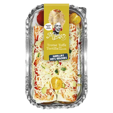 Ingrediënten: 37% tortilla wrap (TARWEbloem, water, palmolie, glucose, zout, emulgator (E471), meelverbeteraar (E920), rijsmiddelen (E450, E500)), courgette, water, 9% kippenvlees, maïs, rode paprika, gepasteuriseerde MELK, spitskool, cherrytomaat, suiker, tomatenpuree, zout, ui, aardappelzetmeel, zuursel, microbieel stremsel, specerijen, azijn, knoflook, gemodificeerd zetmeel, knoflookgranulaat, specerijenextract (SELDERIJ), kruidenextract, cacaopoeder, kruiden (SELDERIJ), glucosestroop, uigranulaat, natuurlijk aroma, gistextract, aroma, dextrose, raapolie, antioxidant (E331), stabilisatoren (E339, E407, E450, E451, E452), voedingszuur (E260), zuurteregelaar (E501).