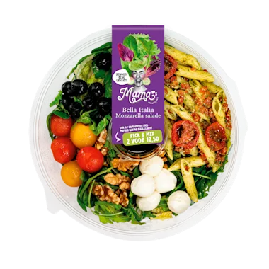 Ingrediënten: gekookte pasta (water, durum TARWEGRIESMEEL, olijfolie, zout), 15% mozzarella (MELK, zout, zuurteregelaar: citroenzuur), gele cherry tomaat, rode cherry tomaat, mesclun mix (sla groen, sla rood, rucola, red chard), dadel-vijg dressing (48% dadelsiroop, balsamico (wijnazijn, geconcentreerde druivensap) (SULFIET), suikerbiet siroop, suiker, gedistilleerde azijn, 5,2% vijg concentraat, smaakstof), semi zongedroogde cherry tomaat (tomaten, zout, zonnebloemolie, kruiden en specerijen), WALNOOT, zwarte olijven (kleurstof: E579), groene pesto (zonnebloemolie, verse basilicum, kaas (MELK, zout, zuursel, microbieel stremsel), olijfolie, pijnboompitten, knoflookpoeder, zwarte peper, zout, voedingszuur: citroenzuur), rode paprika, conserveermiddel: azijn, melkzuur.