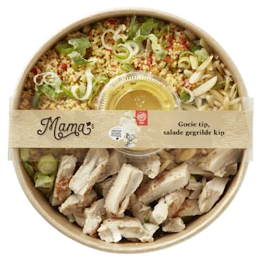 46% gekookte en aangemaakte couscous(water, DURUM TARWEGRIESMEEL, rode paprika,courgette, komkommer, munt, olijfolie, azijn, zout,maltodextrine, natuurlijke aroma’s, aardappelzetmeel,pastinaak, tomaat, wortel, suiker, specerijen, kruiden),19% gegaarde kipdijfilet (95% kipdijfilet, voedingszuren(E262, E326, E330), specerijenextracten,aardappelzetmeel, zout, dextrose, gebufferdazijnzuurpoeder (conserverend ingrediënt)), 15%mesclune mix (sla groen, sla rood, rucola, snijbiet), 12%mango curry dressing (raapolie, suiker, MOSTERDZAAD,azijn, 11% mango, papaja, EIGEEL, water, zout, 0,5%currypoeder, specerijen, aroma’s (SOJA, SELDERIJ), ui,specerij extract, zuurteregelaar: citroenzuur,conserveermiddel (E202), gember, antioxidant (E392)),3,8% AMANDEL, 3,8% lente ui.