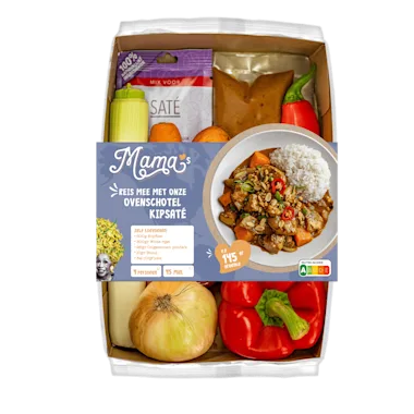 Zelf toevoegen: 500gr Kipfilet, 300gr Witte rijst, 25gr Ongezouten pinda's, 10gr Bosui, 3el (Olijf)olie. ZOALS MAMA 'T BEREIDT: 1. Was de groenten en zoete aardappel goed onder de kraan, dan is het tijd om verder te gaan. 2. Snijd de wortel in schijfjes en de paprika en zoete aardappel in blokjes fijn, daarna de prei, ui en rode peper in dunne ringen, dat zou top zijn. 3. Pers of snijd de knoflook fijn, zonder ongein. 4. Snijd de kip in blokjes, dat is stap één, marineer het met 1 eetlepel olie en satékruidenmix daarna meteen. 5. Verwarm de oven voor op 180 graden en vet de ovenschaal in, dat is alvast een goed begin. 6. Bak de kipfilet vervolgens in een wok- of koekenpan met nog een beetje olie gaar, dan is deze stap klaar. 7. In een andere wok- of koekenpan, roerbak je met een beetje olie de groenten en de zoete aardappel als je kan. Laat het bakken, vijf minuten maar dan is je basis bijna klaar. 8. Verdeel de groenten en zoete aardappel in de schaal, meng de helft van de pindasaus erdoor, dat is eenmaal. Leg de kipblokjes er bovenop, en de rest van de saus giet je lekker on top! 9. De ovenschaal mag nu de oven in, na 20-25 minuten heb je vast zin! 10. Kook de rijst zoals op de verpakking staat, dan weet je dat het goed gaat. 11. Snijd ondertussen de bosuitjes, crunch de pinda's en leg beide klaar, dan komt het straks dik voor elkaar. 12. Zet de ovenschaal op tafel, doe de rijst, een topping van gecrunchte pinda's en de gesneden bosui erbij, maakt het geheel lekker knapperig en blij!