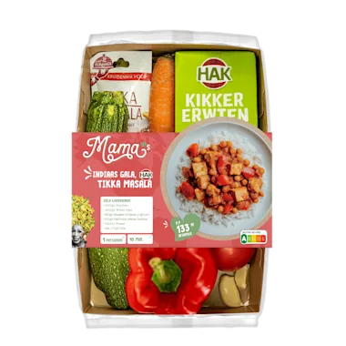 Pakket voor Tikka Masala met kikkererwten, tomaat, ui, wortel, tomatenpuree, kruidenmix, Tikka Masala kruidenmix en knoflook