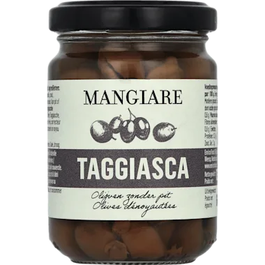 Mangiare Taggiasche olijven zijn zongerijpte donkere olijven uit Taggia, een kleine regio in Noord-Italië. Ze hebben een heerlijke zachte vlezige structuur en zachte, iets zure smaak.
