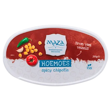 Ingrediënten: 56% kikkererwten, raapolie, 11% chipotle puree (60% Chipotle Chili pepers, water, azijn, uien, suiker, kruiden, zonnebloem olie), 8,5% SESAMPASTA (SESAMZAAD, zout), voedingszuren: citroenzuur, azijnzuur; zout, kruiden en specerijen (bevat koriander), conserveermiddel: kaliumsorbaat