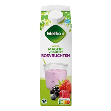 Magere yoghurt (MELK), 7% fruit (50% aardbei, 23% bramen, 13% bosbessen, 14% frambozenpuree), suiker, gemodificeerd maïszetmeel, druivenconcentraat, natuurlijk aroma, vlierbessensapconcentraat, citroensapconcentraat.