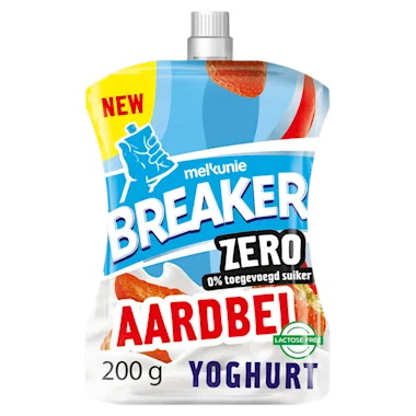 Zero toegevoegd suiker, 100% smaak! Melkunie Breaker Zero Aardbei is een lekker, romig, en lactosevrij yoghurt tussendoortje met echt fruit. De handige verpakking is ideaal voor onderweg.