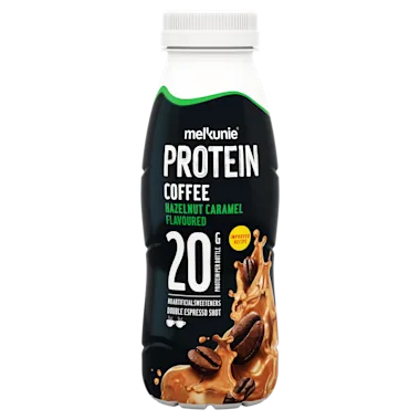 Lactosevrije* melkdrank met koffie en toegevoegde eiwitten, hazelnoot- en karamelsmaak, gesteriliseerd. *Lactosegehalte <lt/>0,01 g/100 ml.