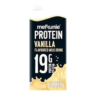 Vanille melkdrank van Melkunie PROTEIN bevat 19 gram eiwit per portie, is vrij van kunstmatige zoetstoffen en is lactosevrij* in een liter verpakking. Ideaal voor thuis.