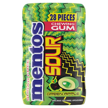 Kauwgum met zure smaak, met appelsmaak. Met zoetstoffen.