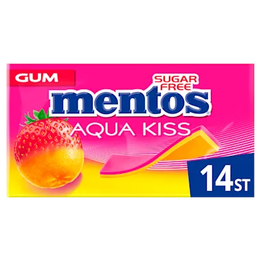 Twee lagen, twee kleuren, twee smaken. Mentos Gum Aqua Kiss Strawberry Mandarin is een zachte kauwgum met fruitsmaak. Twee packs in een verpakking; elk pack bevat 14 individueel verpakte gums.