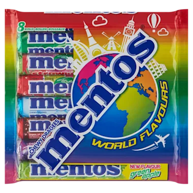Geniet van de wereldse smaken smaken van Mentos. 8 verschillende Mentos rollen in één pack.