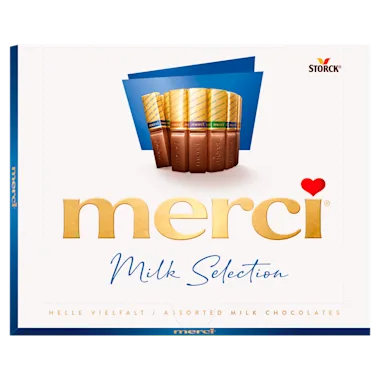 Melkchocolade met hazelnootcrèmevulling; melkchocolade: ten minste 32% cacaobestanddelen. Melkchocolade; melkchocolade: ten minste 32% cacaobestanddelen. Melkchocolade met amandel- en hazelnootstukjes; melkchocolade: ten minste 32% cacaobestanddelen. Melkchocolade met pralinécrèmevulling; melkchocolade: ten minste 32% cacaobestanddelen.