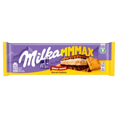 Milka Mmmax Chocoladereep Choco-Swing Biscuit 300g – Chocoladereep van knapperige biscuit met een laagje melkcrème omhuld door heerlijke zachte Milka melkchocolade