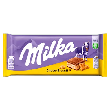 Milka Chocoladereep Choco-Biscuit 100g – reep met vanbinnen een krokante koek en laagje melkcrème omhuld door 100% Alpenmelkchocolade Chocoladereep met een krokante koek vanbinnen en een laagje melkcrème omhuld door onze 100% Alpenmelkchocolade Reep met zachte melkchocolade gemaakt van 100% Alpenmelk. We gebruiken al meer dan 100 jaar enkel melk uit het Alpengebied. De Milka reep komt in een handige, hersluitbare verpakking dus je kunt nog langer van genieten van de heerlijk zachtsmeltende chocolade. Geniet van heerlijk zachtsmeltende Milka chocola met Alpenmelk in alle vormen: chocoladerepen, tabletten, chocolaatjes, bonbons, chocolade-eitjes of hazelnootpasta.