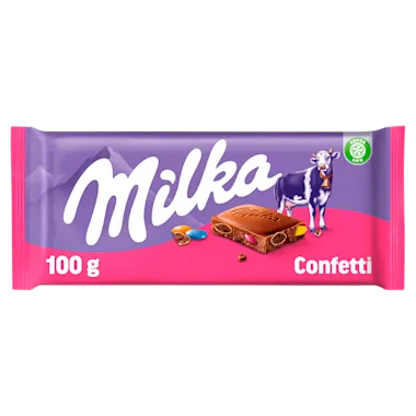 Ontdek alle kleuren van de regenboog in de chocoladereep Milka Confetti: een reep met kleurrijke, krokante chocoladedragees en zachte Milka Alpenmelkchocolade . Dankzij de hersluitbare verpakking geniet je extra lang van de heerlijke chocola. De 100g Milka-repen zijn perfect om jezelf te verwennen of ze met familie en vrienden te delen. Milka bestaat al sinds 1901 en de naam is een samenvoeging van de belangrijkste ingrediënten, melk en cacao. Sinds het begin is de verpakking paars en sinds 1964 is lila onze merkkleur. Sinds de jaren 1970 herken je onze chocola ook via de bekende Milka-koe.