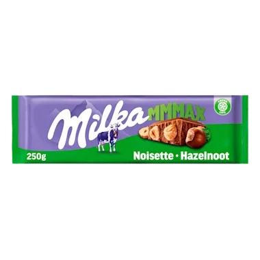 Melkchocolade (van Alpenmelk) met hele hazelnoten.