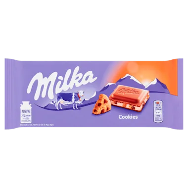 Milka Cookies is een heerlijke chocolade reep van melkchocolade, gevuld met een melkcrèmevulling en knapperige koekstukjes.
