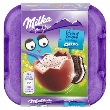 Vier heerlijke Milka chocolade eieren. De Milka lepeleieren bestaan uit zachte melkchocolade met een onweerstaanbare vulling met stukjes Oreo.