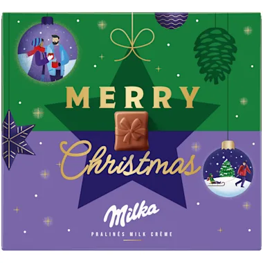 Pralines van melkchocolade (van Alpenmelk) gevuld met melkcrème (39 %).